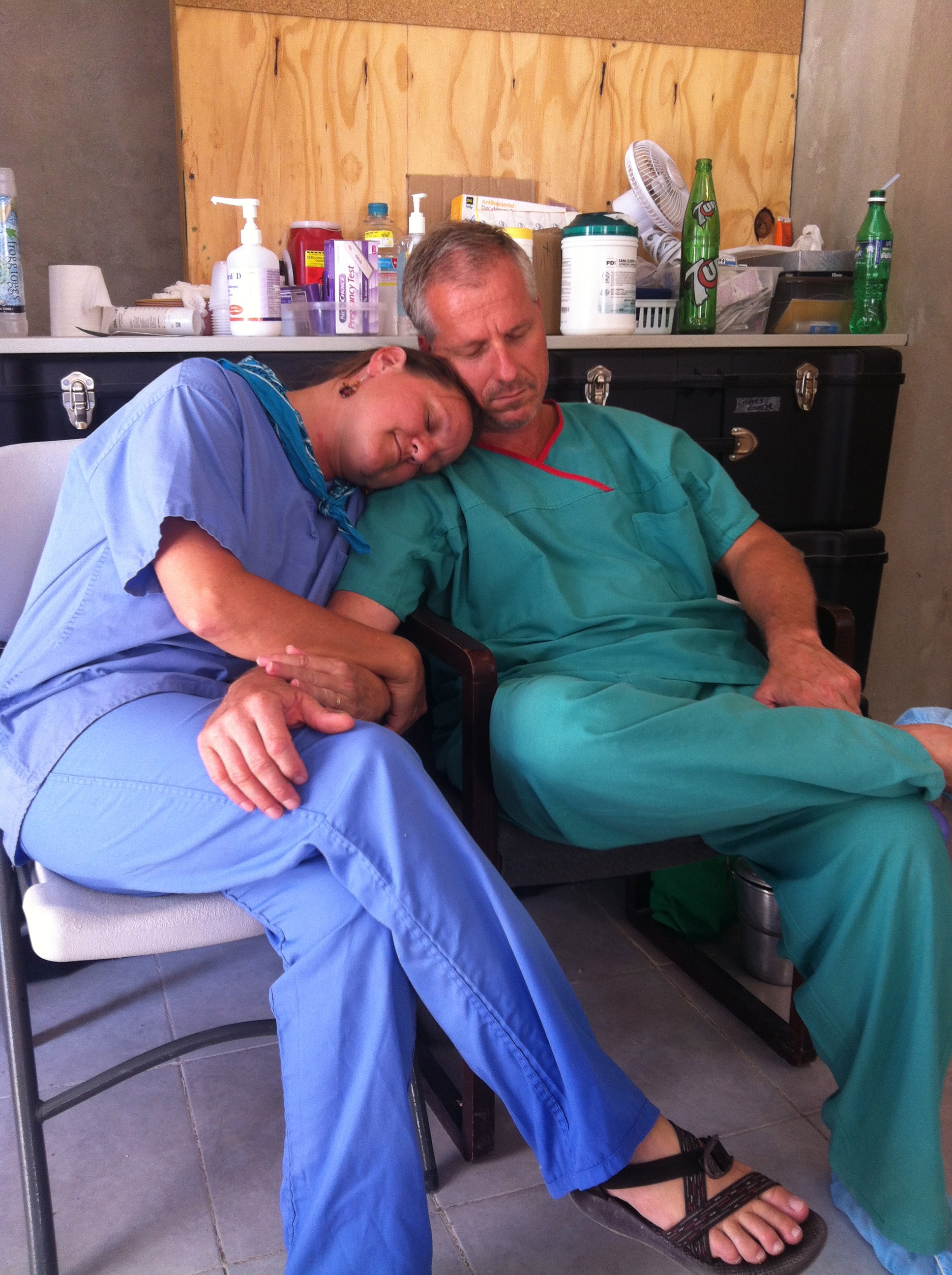 Tony & Mickie catching a nap after a long night in the clinic delivering a baby.